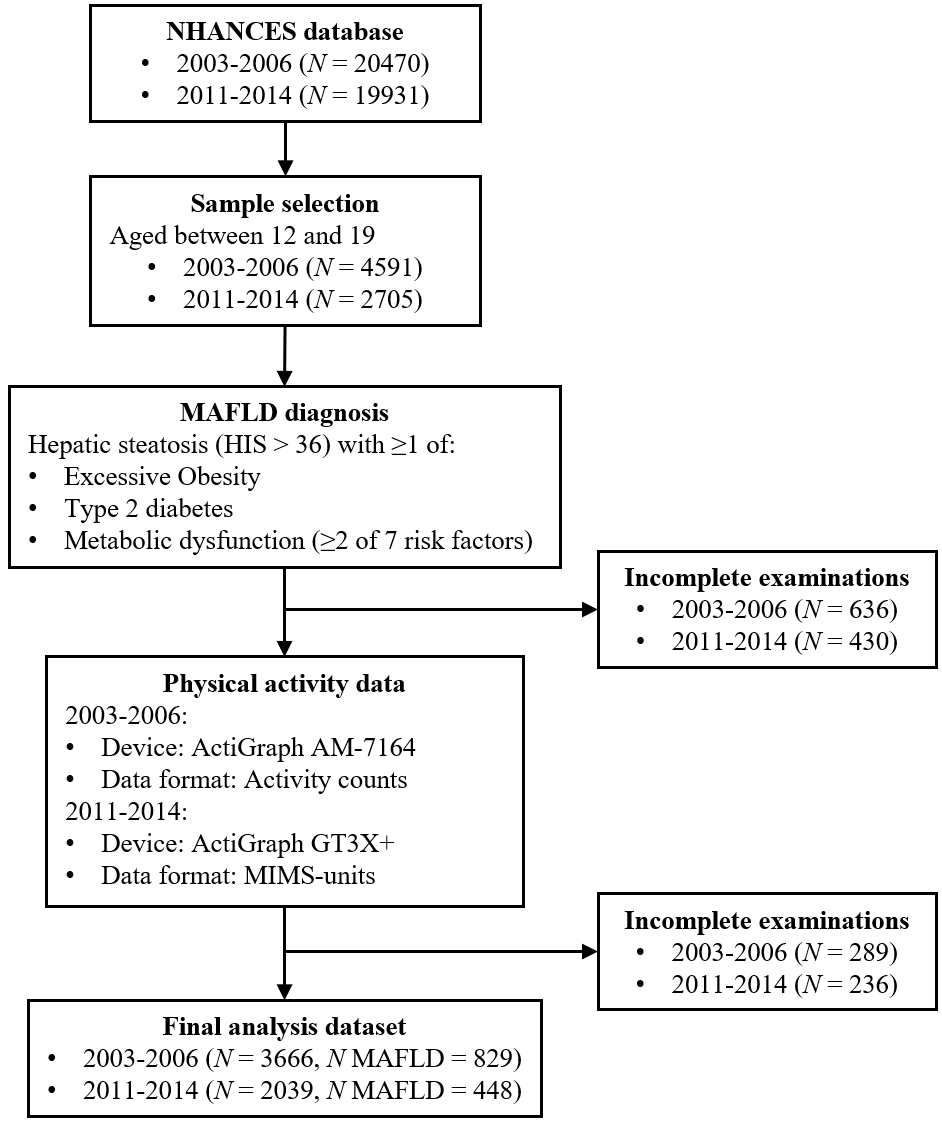 This analysis examines the relationship between physical activity patterns and metabolic dysfunction-associated fatty liver disease (MAFLD) in adolescents aged 12-19 years using NHANES data from 2003-2006 and 2011-2014.