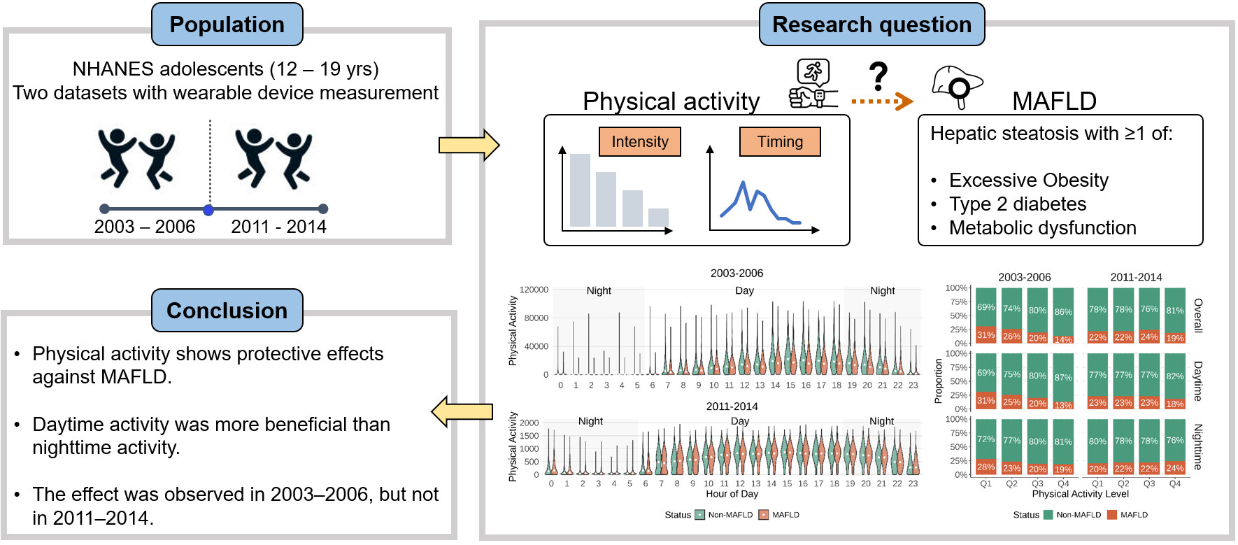 We use accelerometer data to objectively measure physical activity across different times of day (overall, daytime 7:00-19:00, and nighttime). MAFLD is diagnosed using the Hepatic Steatosis Index combined with metabolic risk factors. We employ survey-weighted logistic regression to account for the complex sampling design of NHANES.